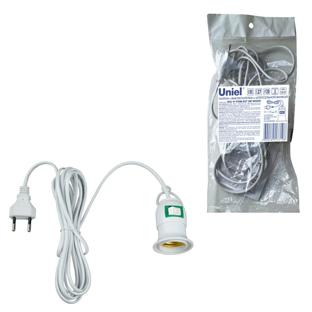 DLC-P-T50B/E27 2M WHITE DLC-P-T50B/E27 2M WHITE Патрон подвесной с выключателем и штепсельной вилкой, 200см. Цоколь Е27. Белый. TM Uniel
