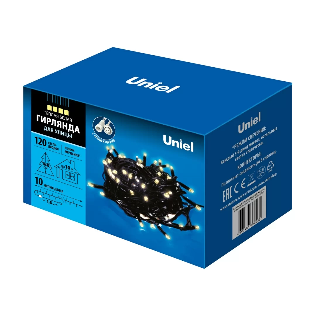 ULD-S1000-120/TBK WARM WHITE IP67 ULD-S1000-120/TBK WARM WHITE IP67 Гирлянда светодиодная с эффектом мерцания, 10м. Соединяемая. 120 светодиодов. Теплый белый свет. Провод черный. TM Uniel.