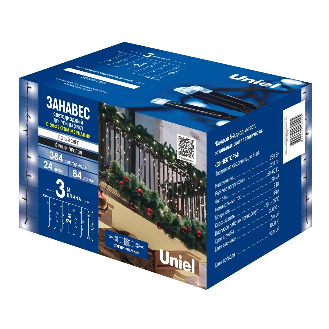 ULD-C3020-384/TBK WHITE IP67 ULD-C3020-384/TBK WHITE IP67 Занавес светодиодный с эффектом мерцания, 3х2м. Соединяемый. 384 светодиода. Белый свет. Провод черный. TM Uniel