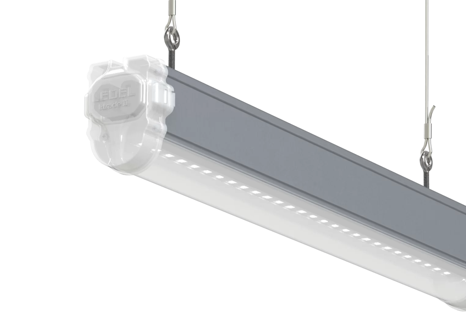 Прочная система торцевого соединения позволяет крепить светильники к потолку или на подвесах через один.