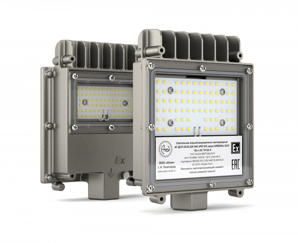 Светильник взрывозащищенный светодиодный АТ-ДСП-26/25-220VAC-IP67-ЕХ серия Арсенал ДУО (25Вт, 5000К, 4000Лм,cos ϕ 0,98, угол 1/2 яркости светодиода 120°, 220В, IP65/IP67 , КСС Д, крепление на трубу 3/4', один светодиодный модуль) производства Атон